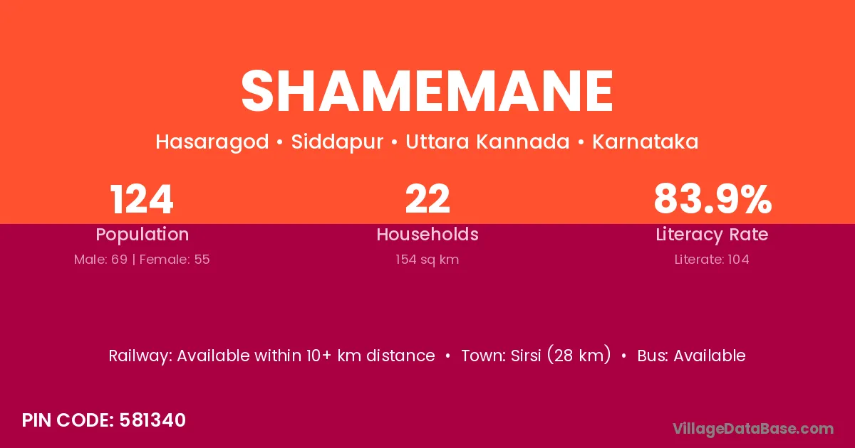 Sirsi (28 km) is the nearest town to Shamemane village for major economic activities and is located approximately 28 km away.