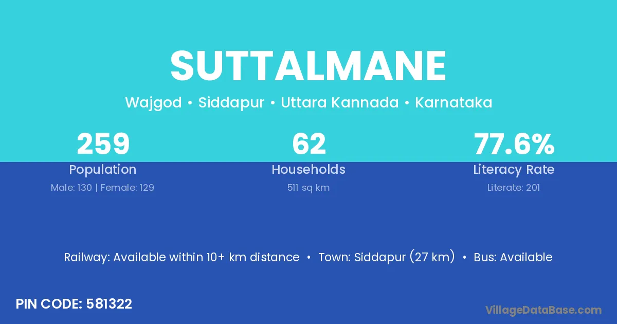 Siddapur (27 km) is the nearest town to Suttalmane village for major economic activities and is located approximately 27 km away.
