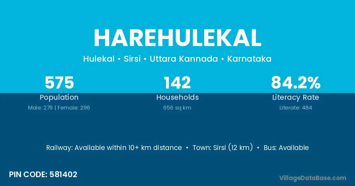 Sirsi (12 km) is the nearest town to Harehulekal village for major economic activities and is located approximately 12 km away.
