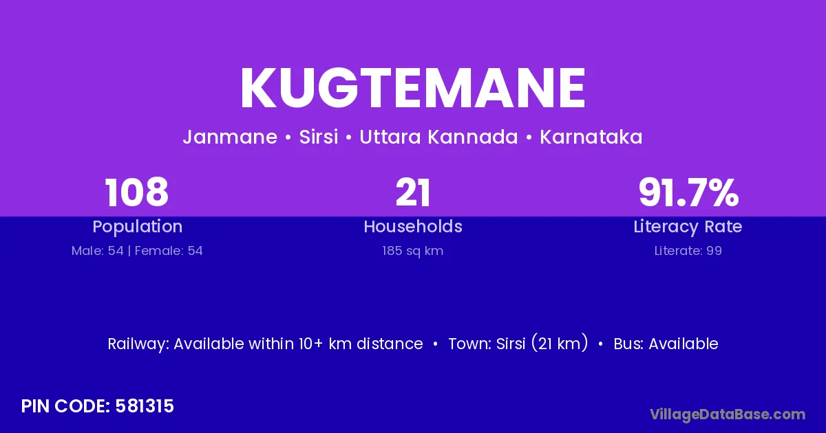 Sirsi (21 km) is the nearest town to Kugtemane village for major economic activities and is located approximately 21 km away.