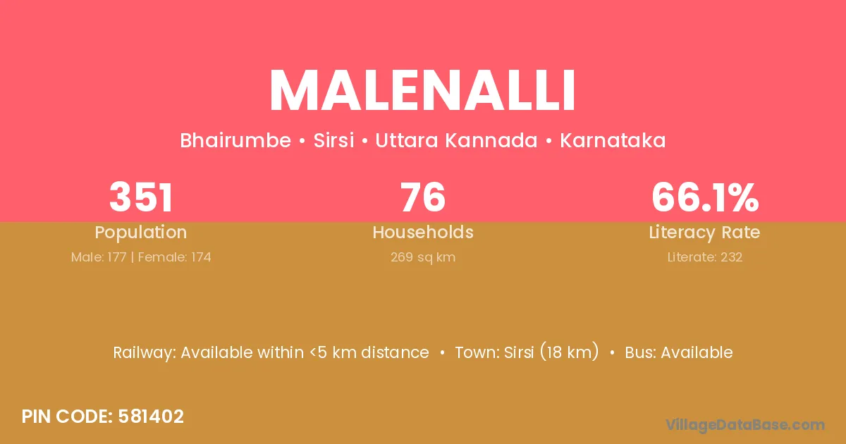 Sirsi (18 km) is the nearest town to Malenalli village for major economic activities and is located approximately 18 km away.