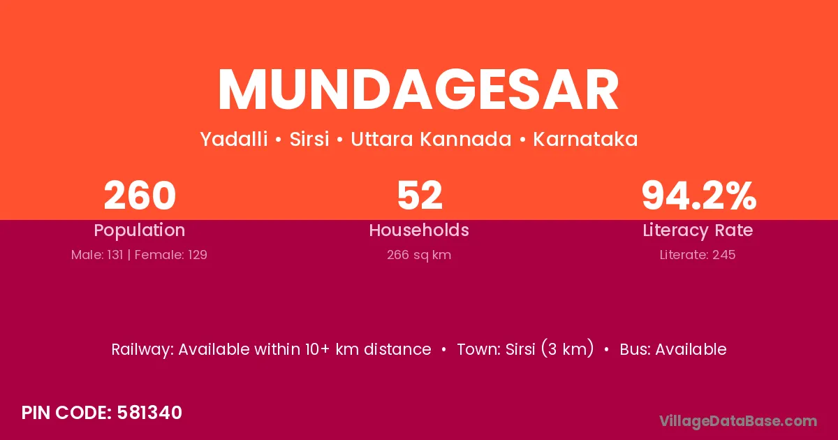 Sirsi (3 km) is the nearest town to Mundagesar village for major economic activities and is located approximately 3 km away.