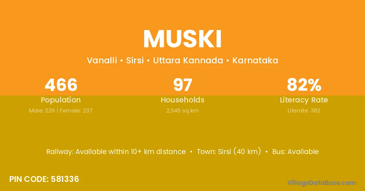 Sirsi (40 km) is the nearest town to Muski village for major economic activities and is located approximately 40 km away.