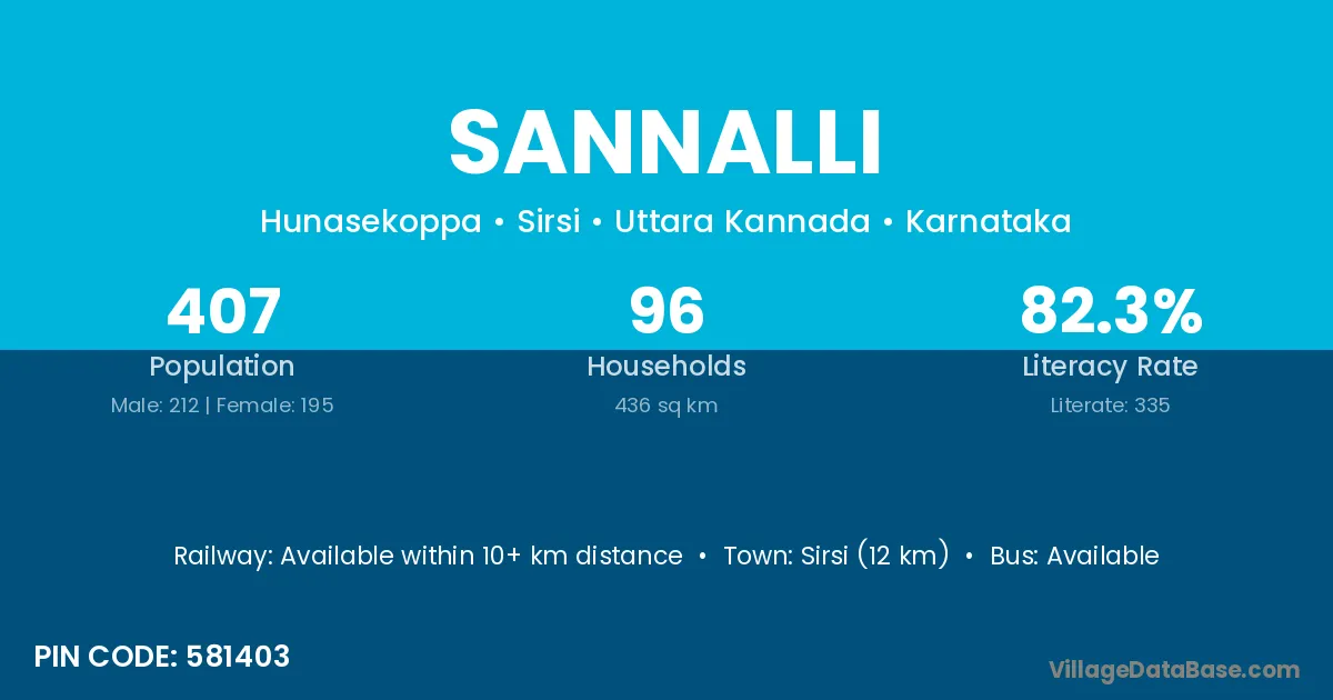 Sirsi (12 km) is the nearest town to Sannalli village for major economic activities and is located approximately 12 km away.
