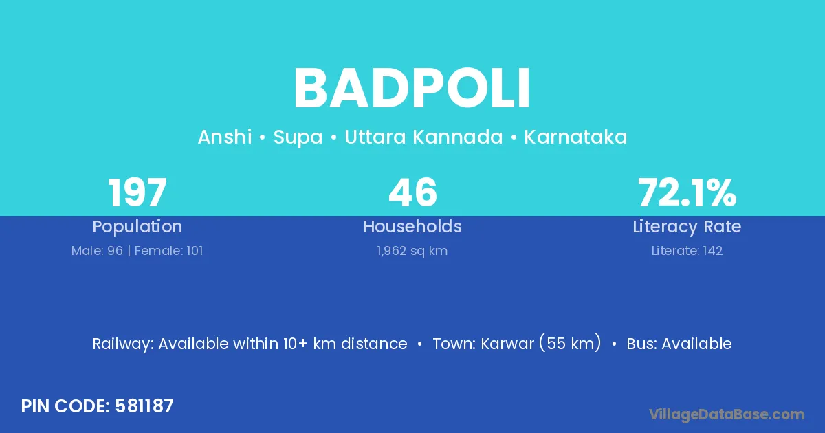 Karwar (55 km) is the nearest town to Badpoli village for major economic activities and is located approximately 55 km away.