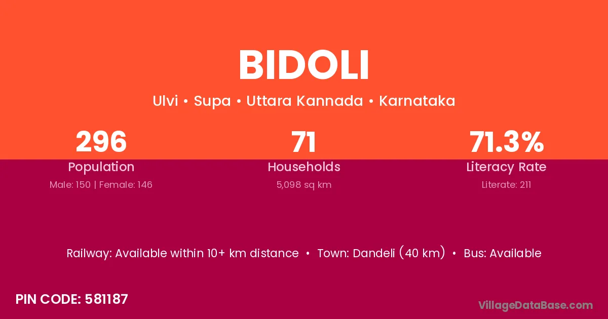 Dandeli (40 km) is the nearest town to Bidoli village for major economic activities and is located approximately 40 km away.