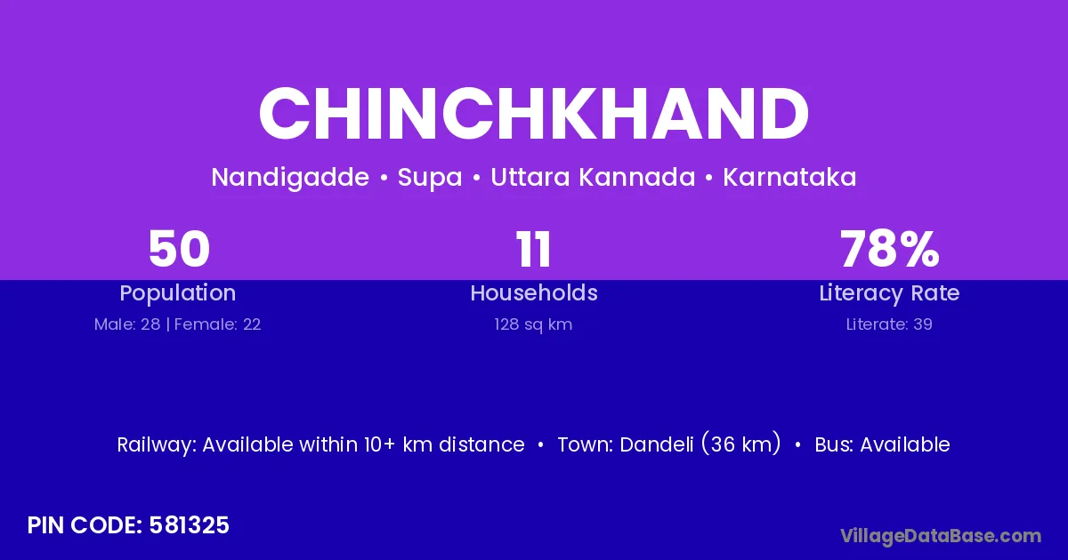 Dandeli (36 km) is the nearest town to Chinchkhand village for major economic activities and is located approximately 36 km away.