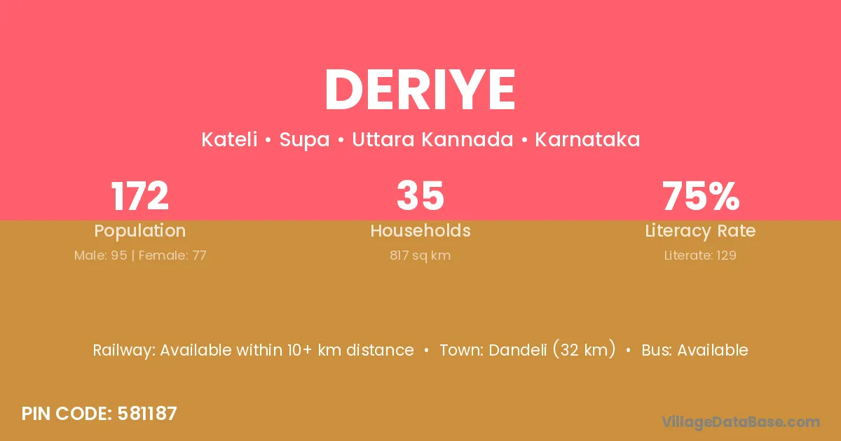 Dandeli (32 km) is the nearest town to Deriye village for major economic activities and is located approximately 32 km away.