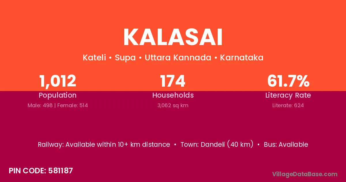 Dandeli (40 km) is the nearest town to Kalasai village for major economic activities and is located approximately 40 km away.
