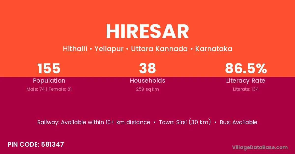 Sirsi (30 km) is the nearest town to Hiresar village for major economic activities and is located approximately 30 km away.