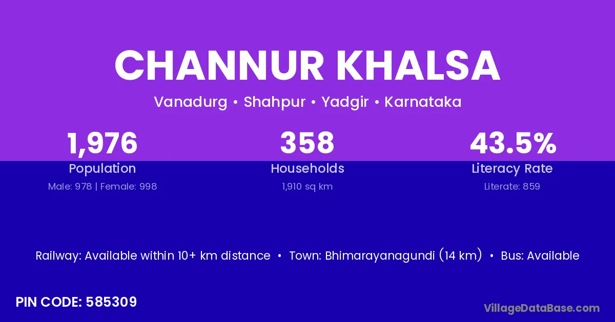 Bhimarayanagundi (14 km) is the nearest town to Channur Khalsa village for major economic activities and is located approximately 14 km away.