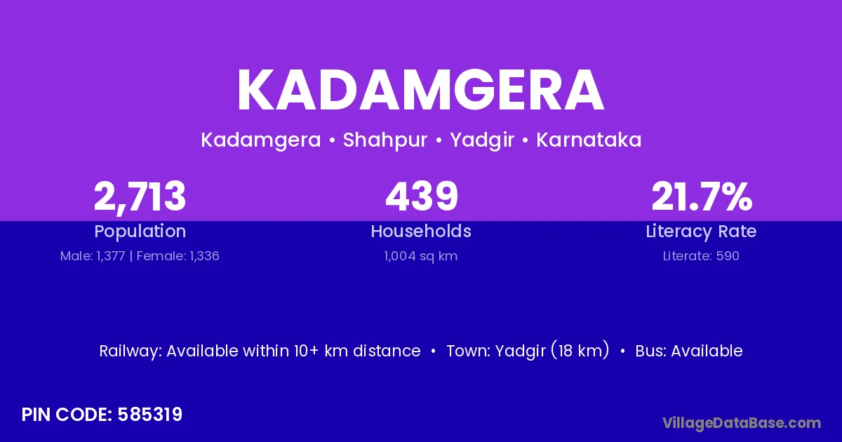 Yadgir (18 km) is the nearest town to Kadamgera village for major economic activities and is located approximately 18 km away.