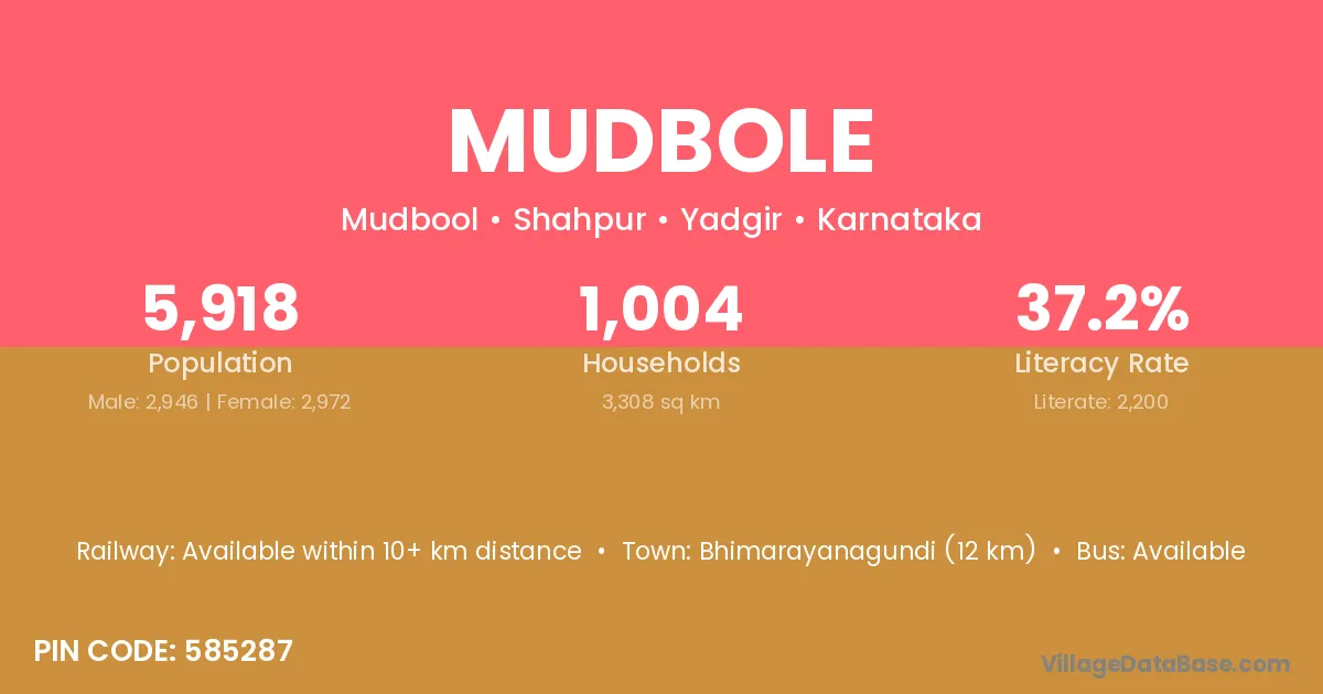 Bhimarayanagundi (12 km) is the nearest town to Mudbole village for major economic activities and is located approximately 12 km away.