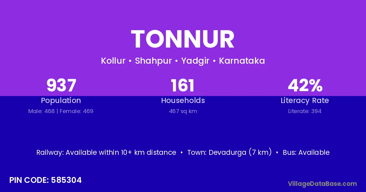 Devadurga (7 km) is the nearest town to Tonnur village for major economic activities and is located approximately 7 km away.