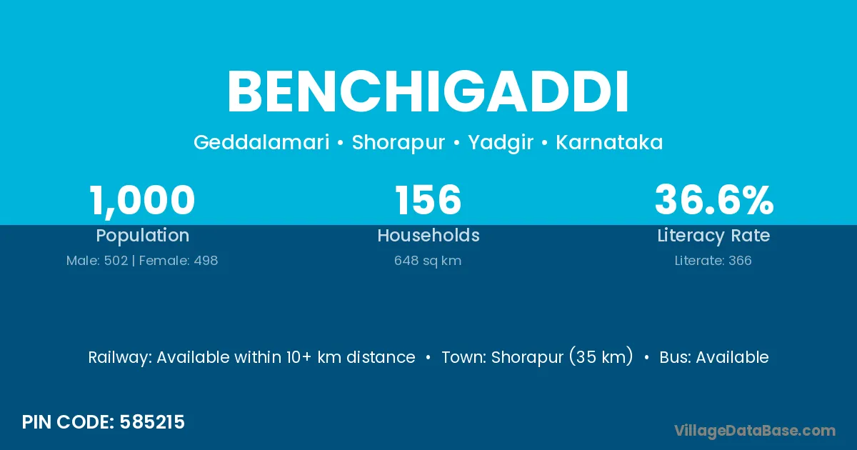 Shorapur (35 km) is the nearest town to Benchigaddi village for major economic activities and is located approximately 35 km away.