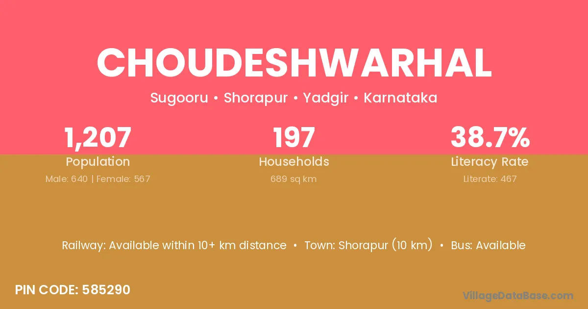 Shorapur (10 km) is the nearest town to Choudeshwarhal village for major economic activities and is located approximately 10 km away.