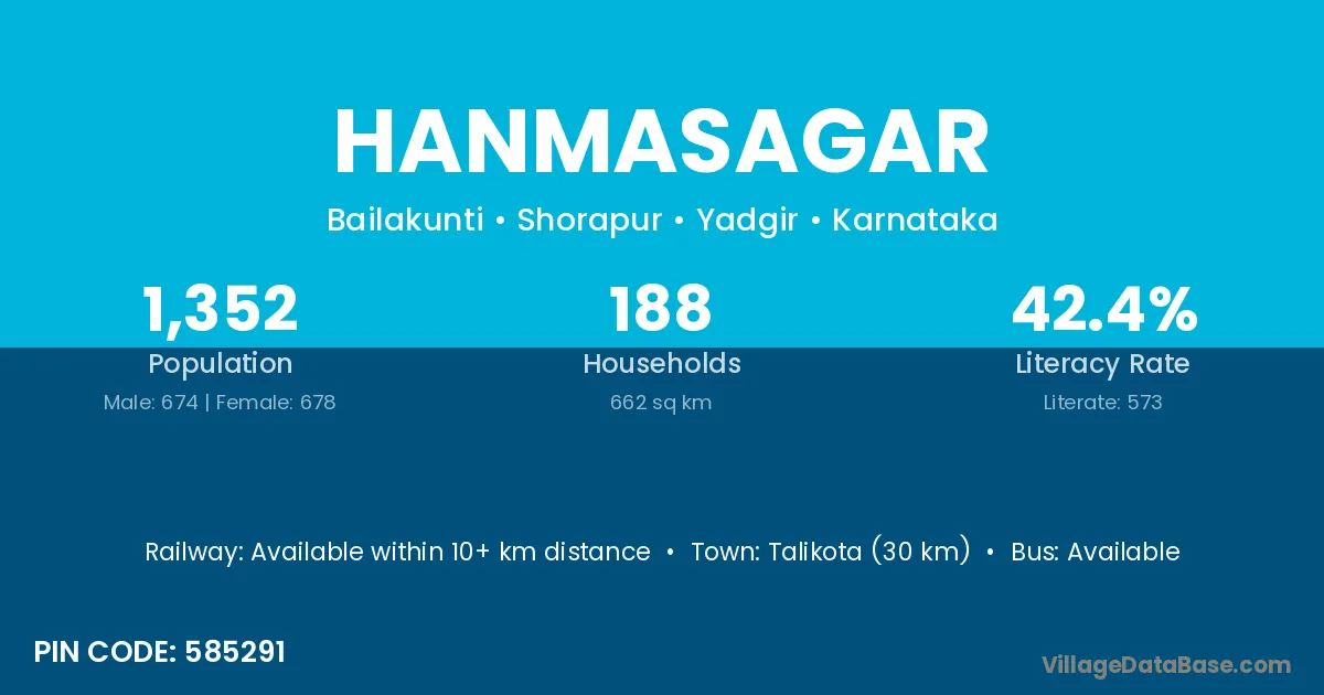 Talikota (30 km) is the nearest town to Hanmasagar village for major economic activities and is located approximately 30 km away.