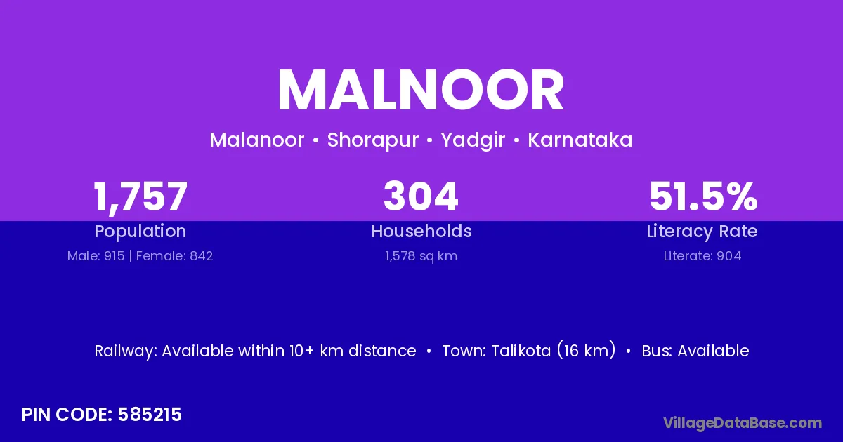Talikota (16 km) is the nearest town to Malnoor village for major economic activities and is located approximately 16 km away.