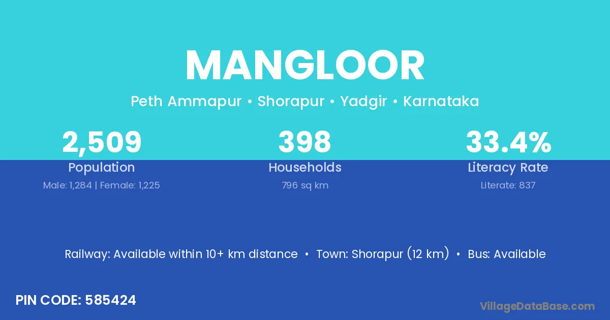 Shorapur (12 km) is the nearest town to Mangloor village for major economic activities and is located approximately 12 km away.