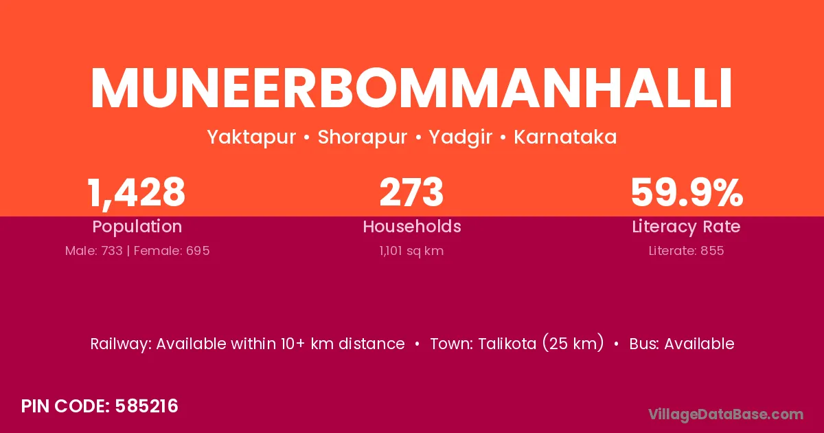 Talikota (25 km) is the nearest town to Muneerbommanhalli village for major economic activities and is located approximately 25 km away.