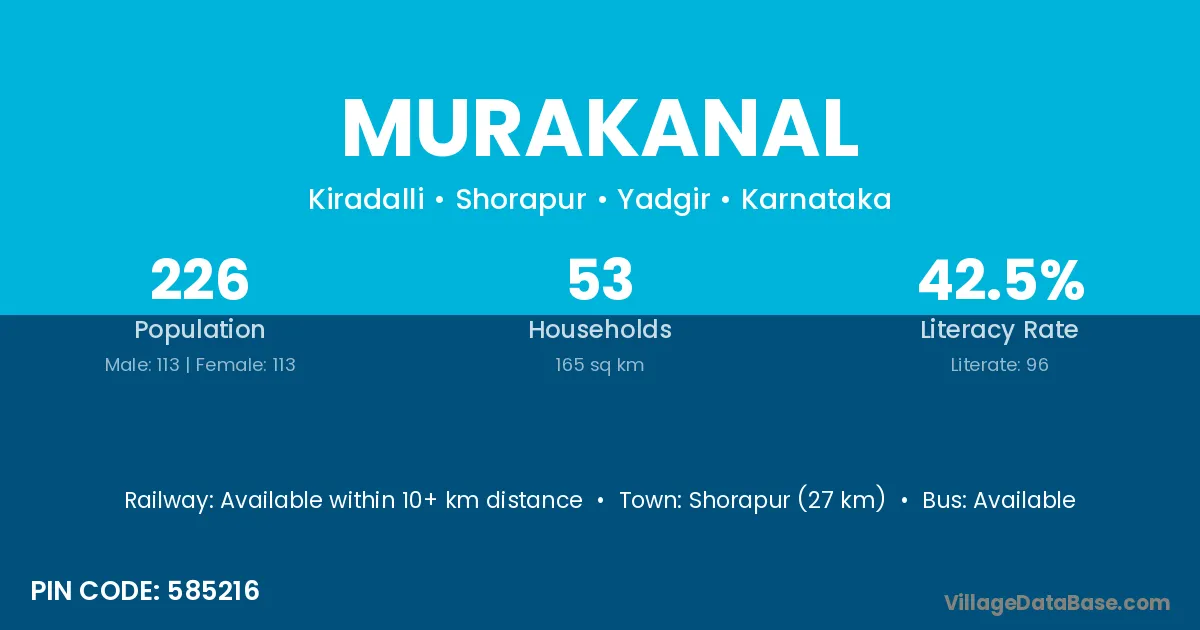 Shorapur (27 km) is the nearest town to Murakanal village for major economic activities and is located approximately 27 km away.