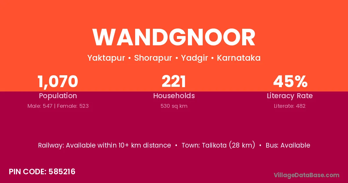 Talikota (28 km) is the nearest town to Wandgnoor village for major economic activities and is located approximately 28 km away.