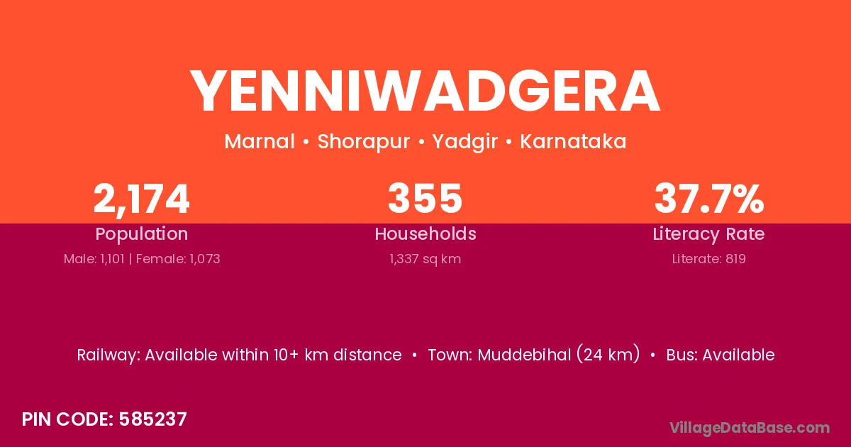 Muddebihal (24 km) is the nearest town to Yenniwadgera village for major economic activities and is located approximately 24 km away.