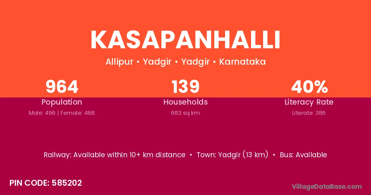 Kasapanhalli village has a total population of 964 people, of which 496 are males and 468 are females.