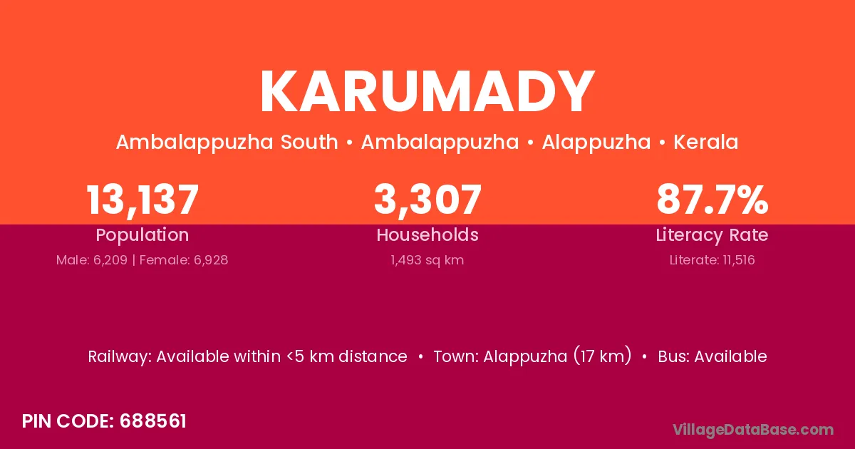 Alappuzha (17 km) is the nearest town to Karumady village for major economic activities and is located approximately 17 km away.