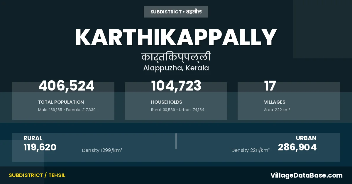 According to the 2011 census The total area of Karthikappally Taluka is 222 km², with a population of 406524 people. The population density is 1,832 inhabitants per square kilometre, and there are approximately 104723 houses in the sub district.