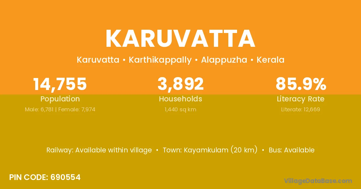 Kayamkulam (20 km) is the nearest town to Karuvatta village for major economic activities and is located approximately 20 km away.