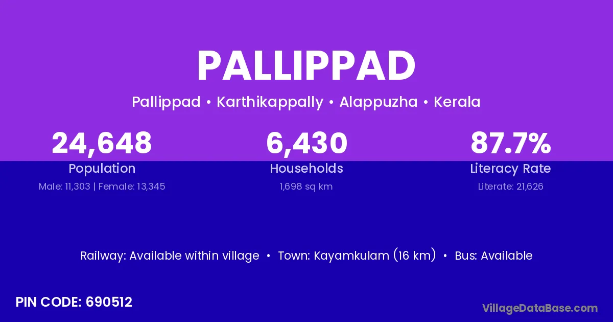 Kayamkulam (16 km) is the nearest town to Pallippad village for major economic activities and is located approximately 16 km away.