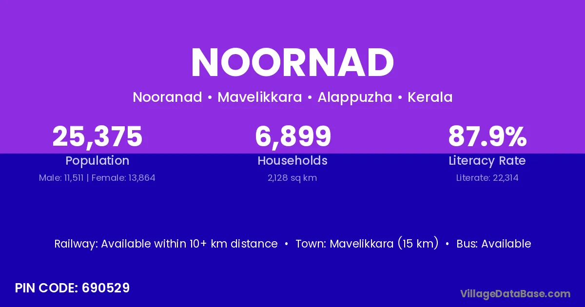 Mavelikkara (15 km) is the nearest town to Noornad village for major economic activities and is located approximately 15 km away.