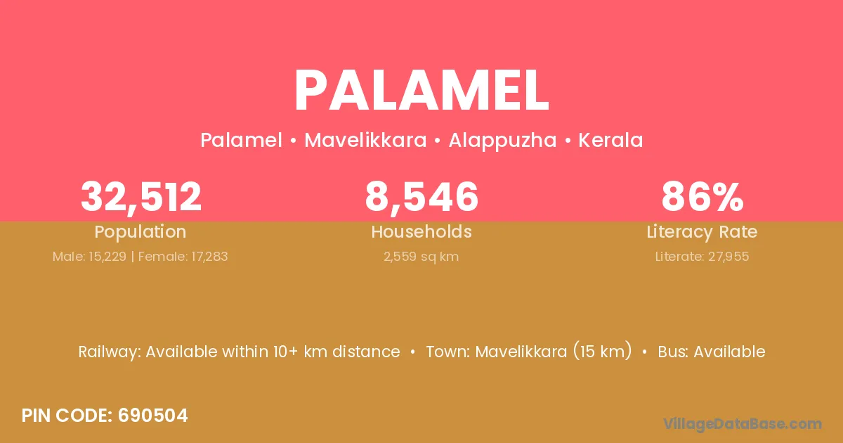 Mavelikkara (15 km) is the nearest town to Palamel village for major economic activities and is located approximately 15 km away.