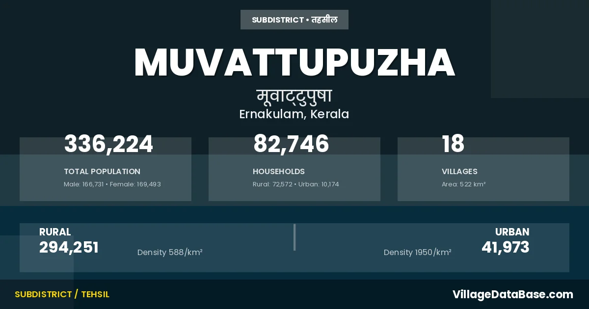 According to the 2011 census The total area of Muvattupuzha Taluka is 522 km², with a population of 336224 people. The population density is 644 inhabitants per square kilometre, and there are approximately 82746 houses in the sub district.