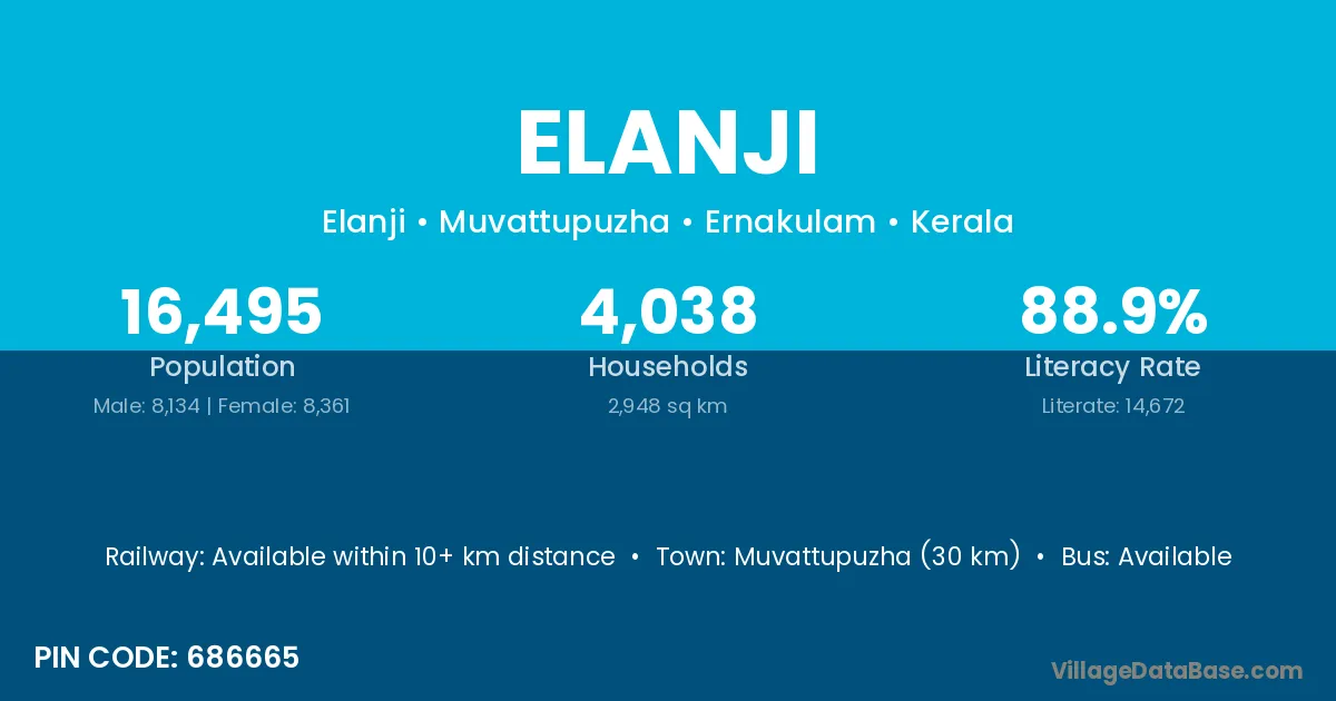 Muvattupuzha (30 km) is the nearest town to Elanji village for major economic activities and is located approximately 30 km away.