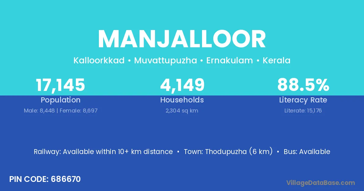 Thodupuzha (6 km) is the nearest town to Manjalloor village for major economic activities and is located approximately 6 km away.