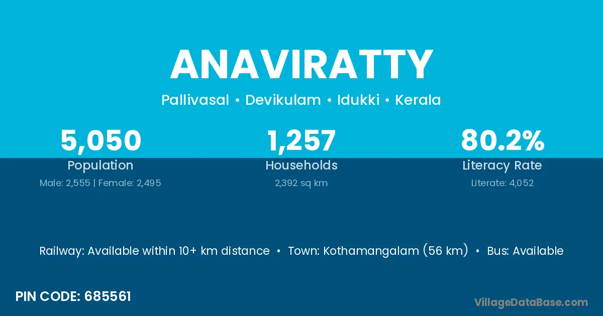Kothamangalam (56 km) is the nearest town to Anaviratty village for major economic activities and is located approximately 56 km away.