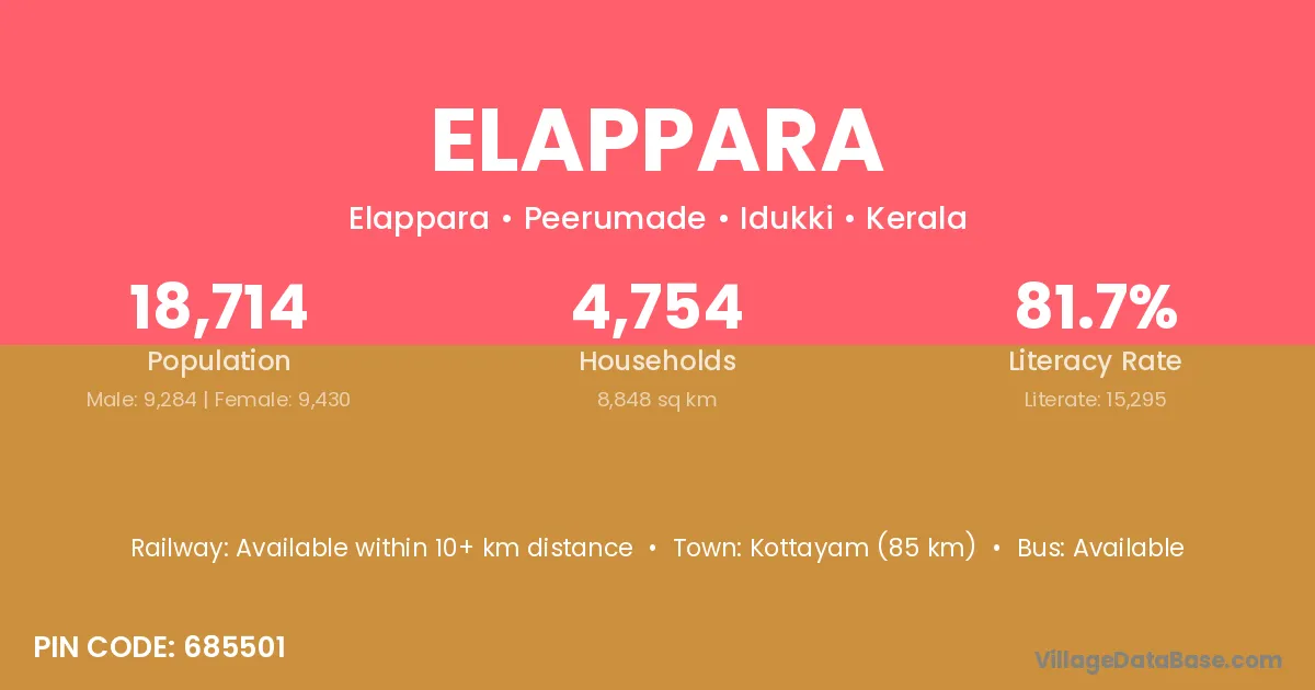 Elappara village has a total population of 18,714 people, of which 9,284 are males and 9,430 are females.