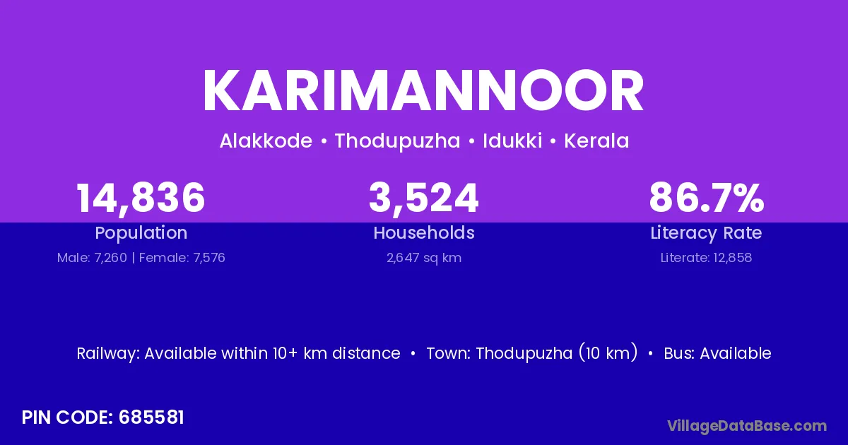 Karimannoor village has a total population of 14,836 people, of which 7,260 are males and 7,576 are females.