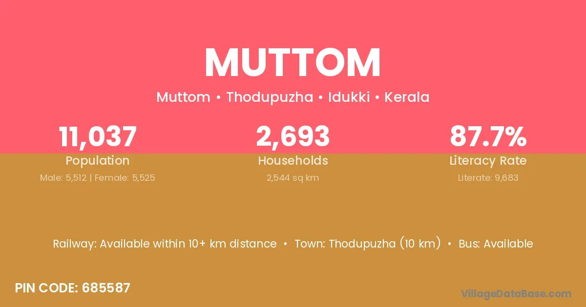 Thodupuzha (10 km) is the nearest town to Muttom village for major economic activities and is located approximately 10 km away.