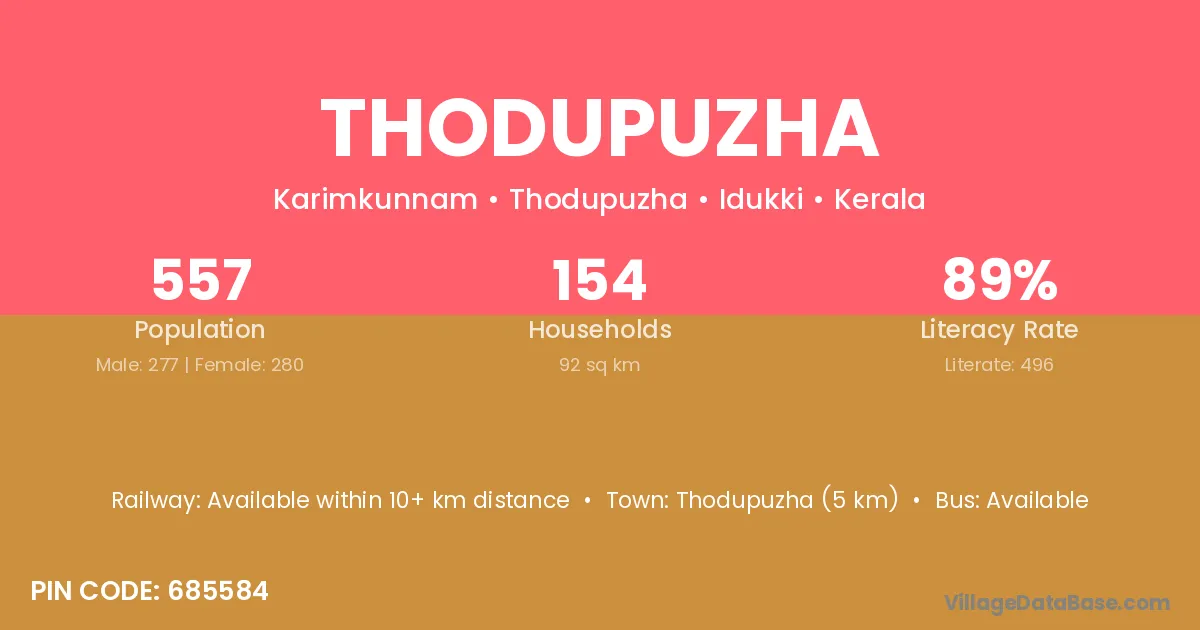 Thodupuzha (5 km) is the nearest town to Thodupuzha village for major economic activities and is located approximately 5 km away.