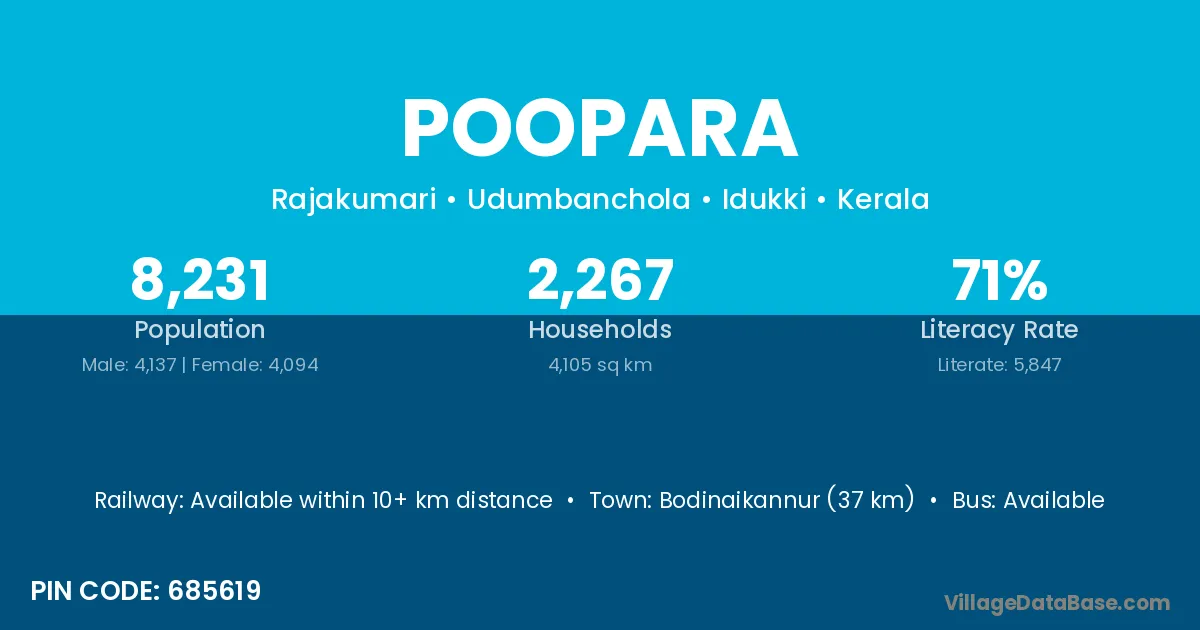 Bodinaikannur (37 km) is the nearest town to Poopara village for major economic activities and is located approximately 37 km away.