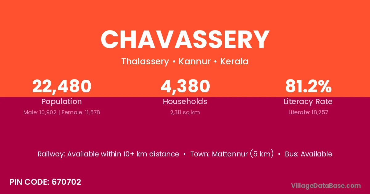 Mattannur (5 km) is the nearest town to Chavassery village for major economic activities and is located approximately 5 km away.