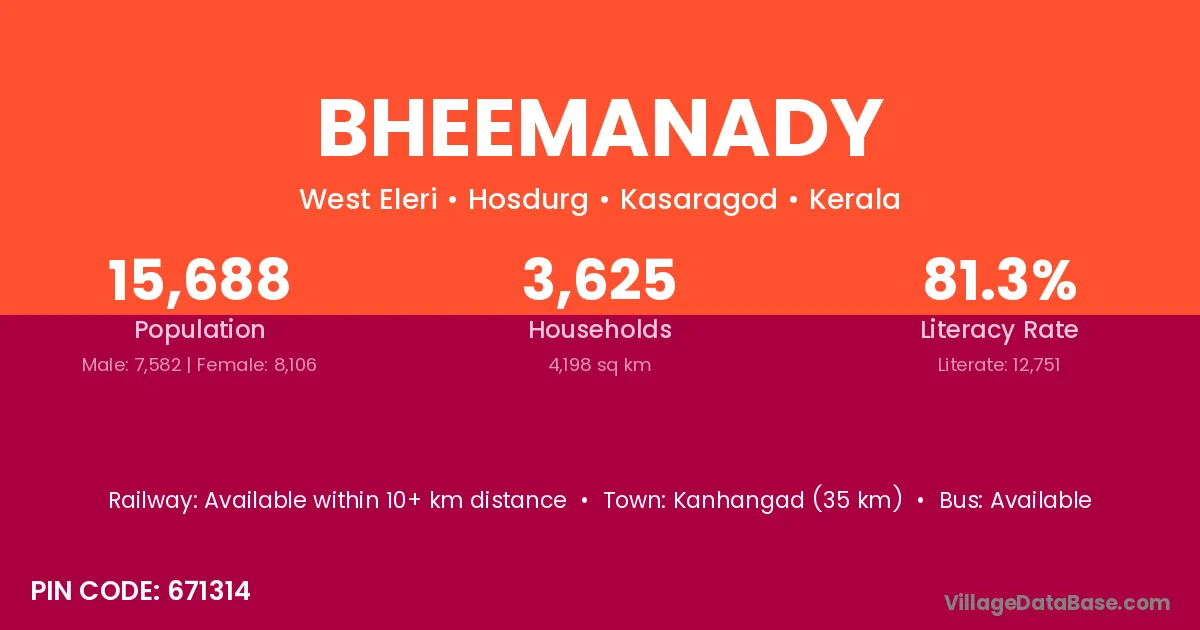 Kanhangad (35 km) is the nearest town to Bheemanady village for major economic activities and is located approximately 35 km away.