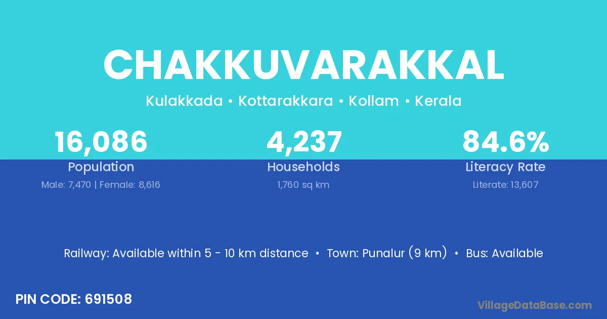 Chakkuvarakkal village has a total population of 16,086 people, of which 7,470 are males and 8,616 are females.