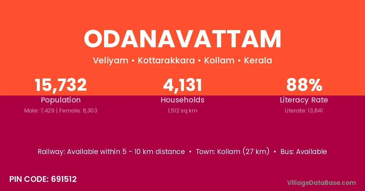 Kollam (27 km) is the nearest town to Odanavattam village for major economic activities and is located approximately 27 km away.