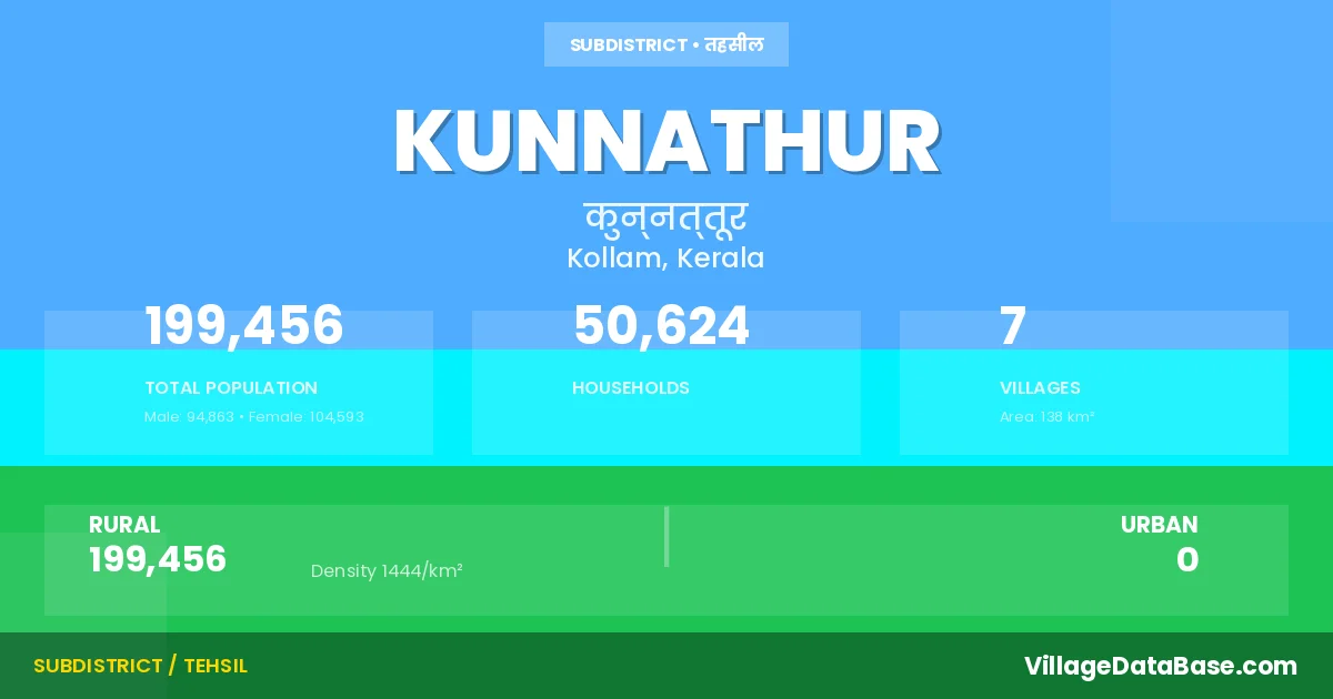 Kunnathur is a town and Taluka in the Kollam district of the Kerala. In India, a Taluka is a subdivision of a district responsible for the administration and revenue collection of a specific area within the district. Talukas play a crucial role in the local governance structure, contributing significantly to the development and administration of their communities.