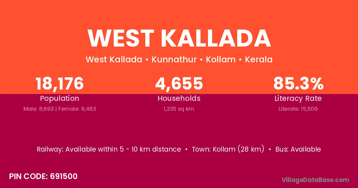 Kollam (28 km) is the nearest town to West Kallada village for major economic activities and is located approximately 28 km away.