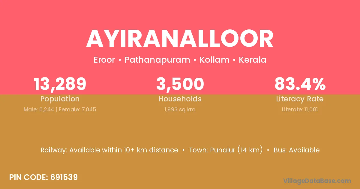 Punalur (14 km) is the nearest town to Ayiranalloor village for major economic activities and is located approximately 14 km away.
